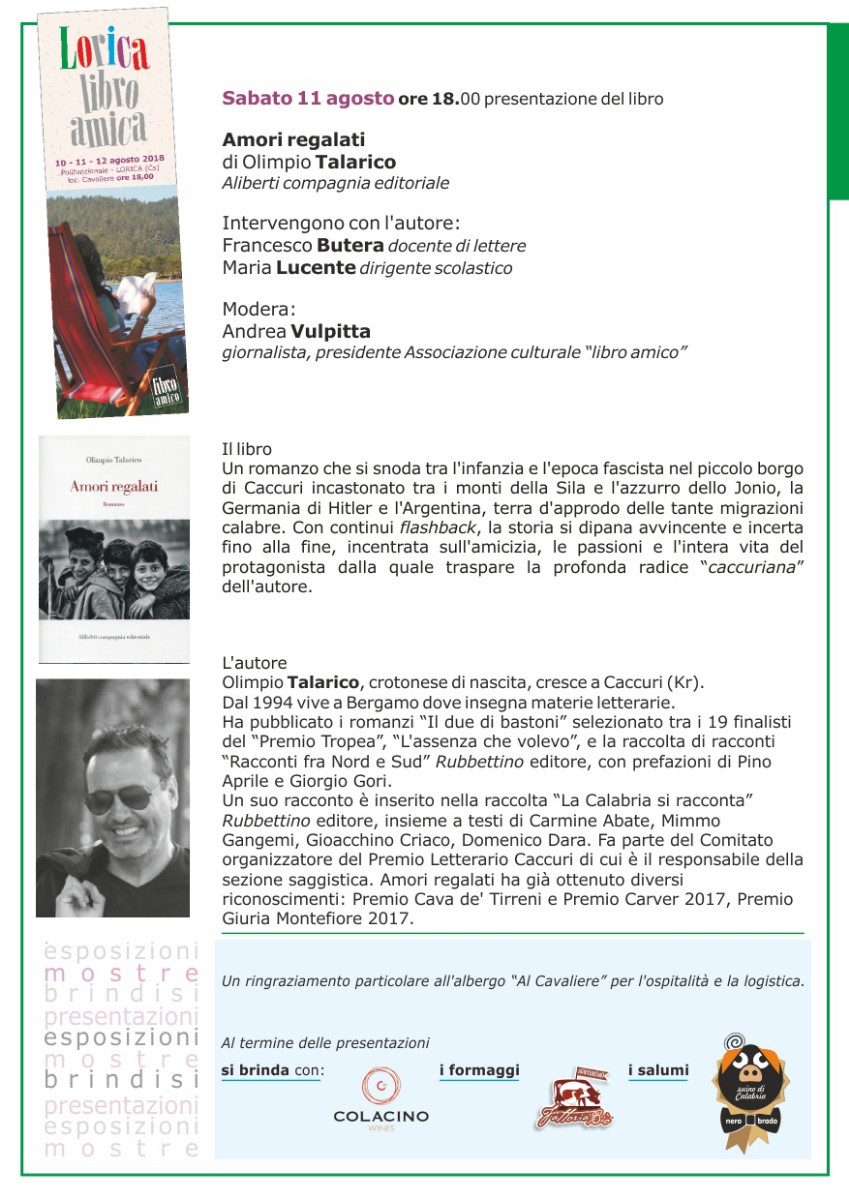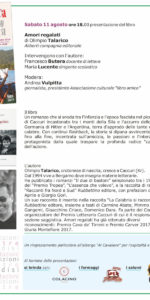 Si prosegue sabato 11 con la presentazione del libro “Amori regalati” di Olimpio Talarico (Aliberti compagnia editoriale), con la presenza dell’autore e di Francesco Butera docente di lettere.