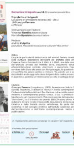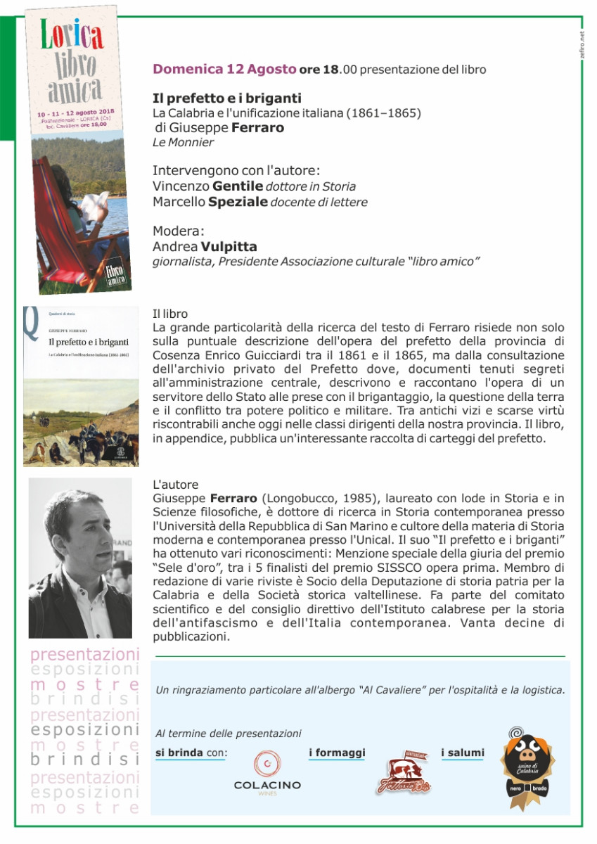 Chiude la manifestazione la presentazione del libro “Il prefetto e i briganti – La Calabria e l’unificazione italiana (1861 – 1865)” di Giuseppe Ferraro (Le Monnier), con la presenza dell’autore, di Vincenzo Gentile, dottore di storia e Marcello Speziale, docente di lettere.