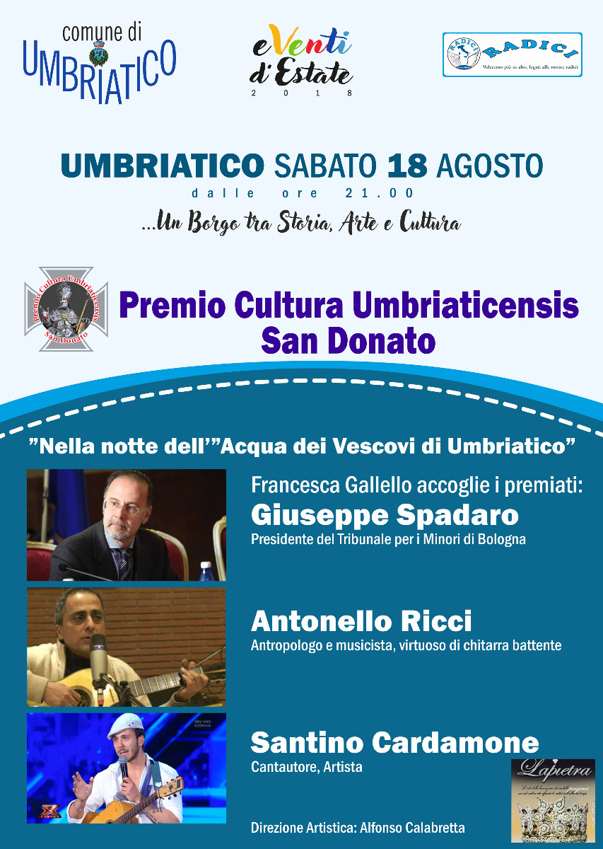 Il 18 agosto prossimo, nel piccolo borgo di Umbriatico, avrà luogo il  quarto “Premio Cultura Umbriaticensis San Donato”,  istituito nel 2014 dalla sezione RADICI di Umbriatico,  nato da una idea di Francesca Gallello, fondatrice dell’Associazione RADICI e fortemente voluto dal Sindaco, Rosario Pasquale Abenante. Dedicato al Santo Patrono dell’antico borgo, il premio firmato dall’artista orafo La Pietra, viene assegnato a chi ha dato e dà un forte contributo culturale e sociale al meridione. Umbriatico, per collocazione geografica, è stata storicamente terra di insediamenti e di incontri di popolazioni e civiltà provenienti dall’area mediterranea, quindi depositaria di antiche tradizioni, sedimentatesi nel tempo grazie ai contributi di diverse componenti culturali, etniche e religiose. Il premio, che ha Umbriatico come territorio di riferimento, si fa interprete di questa eredità con l’istituzione di questa iniziativa che intende riconoscere i meriti di quanti contribuiscono all’approfondimento e alla conoscenza della cultura calabrese ed in particolare del territorio umbriaticese volto a favorire il dialogo tra le diverse espressioni culturali italiane attraverso ogni mezzo di contaminazione culturale, promuovendo attraverso l’associazione “Radici” e con il coinvolgimento di tutti gli attori del territorio che muovono la cultura, la presa di coscienza di quello che le nostre popolazioni hanno prodotto e producono in termine di “culture” e quindi destinato ad incidere positivamente sulla crescita culturale e sociale. Come si ricorderà, nella prima edizione del 2014, il premio, in una serata di arte e cultura è stato assegnato a Don Pontieri, per il suo libro in cui inserisce l’importante storia di Umbriatico. Nella seconda edizione del 2015, il premio è stato assegnato allo storico, scrittore, giornalista, Pino Aprile; al prof. Charlie Barnao, docente di sociologia presso università Magna Graecia di Catanzaro; A Francesco Tarantino, filosofo e poeta; Ai Carboidrati, gruppo musicale;a Giuseppina Longo, farmacista ricercatrice; A Nino Manti, produttore ed inventore della bibita al Bergamotto; Nell’agosto del 2017 la terza edizione, è stato premiato il Cinematografaro, poeta e scrittore umbriaticese Enzo Nigro, personaggio dal grande carisma che ha vissuto per trentasei anni il grande cinema italiano dei grandi nomi come De Sica, Lizzani… e pellicole riconosciute in campo internazionale. In questa quarta edizione, ancora nomi di prestigio della terra di Calabria, il Premio Cultura  Umbriaticensis San Donato 2018 è stato assegnato a Giuseppe Spadaro, Presidente del Tribunale per i Minori di Bologna, Antonello Ricci, antropologo, docente Universitario presso al Sapienza di Roma e cultore della chitarra battente, Santino Cardamone, cantautore e musicista. Quest’anno la direzione artistica è curata dallo scenografo Alfonso Calabretta; e sarà presentato dalla stessa fondatrice di “Radici”, Francesca Gallello. lI Premio, quest’anno,  coincide con la giornata dell'”Acqua dei Vescovi di Umbriatico”,  borgo ricco di acque purissime per la morfologia del luogo che  ha sempre avuto varie sorgenti descritte negli annali dell’antica diocesi sede di settantadue Vescovi i quali sin dalla costruzione della ex Cattedrale intorno all’anno mille si approvvigionavano da diverse fonti sparse nel paese per il vivere quotidiano. Per questo, il 18 agosto si vuole celebrare anche  l’acqua, che rappresenta lo scorrere del tempo e  come simbolo di guarigione, dove la purificazione diviene anche un elemento fisico che porta benessere, che cambia la realtà, e genera nuove forme, grazie anche alla sua capacità di erosione, e quindi di trasformazione, degli elementi e simbolicamente di un popolo.