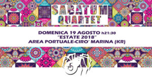 A Cirò Marina il Concerto dei “Sabatum Quartet”, domenica 19 agosto 2018 nell’Area Portale di Cirò Marina con canzoni e musiche dalla tipica tarantella calabrese, a canti di repertorio tradizionale, a pezzi di contenuto socio-politico (brigantaggio, questione meridionale…)