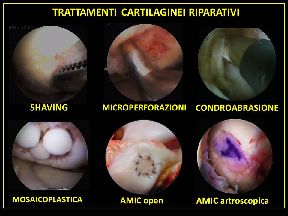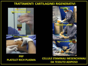 “Prima si tentava, attraverso tecniche artroscopiche, di stimolare la cartilagine, inizialmente con uno shaving (semplice pulizia con uno strumento motorizzato delle fibrille alterate della cartilagine), poi una condroabrasione (stimolazione a radiofrequenze degli strati profondi della cartilagine con elevate temperature), a seguire con le microperforazioni (creando dei buchetti dove mancava la cartilagine, per far sì che sanguini l’osso sottostante e col sanguinamento arrivassero sostanze per far riparare in loco l’erosione cartilaginea) o trapianti di cartilagine (AMIC – Autologous Matrix Implantation Chondrocytes – prelievo di cellule cartilaginee del paziente da una zona non di carico, sviluppo in laboratorio di una membrana di cellule del paziente, impianto nel sito mancante della membrana di cartilagine così costruita). Nell’ultimo decennio è stato scoperto il famoso gel piastrinico (PRP –Platelet-Rich Plasma (plasma estratto dal sangue del paziente arricchito delle sue piastrine): la scoperta che all’interno dei granuli piastrinici fossero presenti delle proteine che iniettate in un ambiente specifico favorissero la differenziazione di determinati ceppi cellulari verso linee specifiche- in questo caso la linea cartilaginea- sfruttava la teoria della “condro-induzione”. È stato studiato anche questo, sia su cavie animali che sull’uomo: buoni risultati nell’osso, nelle lesioni muscolo-tendinee, risultati altalenanti nell’artrosi. Personalmente, ho un 50% dei pazienti che ho trattato col PRP che è soddisfatto (con riduzione del dolore) e un 50% senza alcun effetto”.
