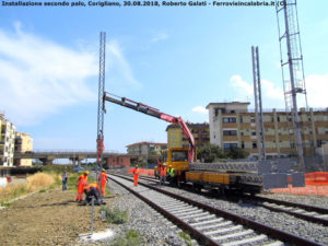Nella calda giornata di ieri, abbiamo infatti assistito presso la totalmente rinnovata stazione di Corigliano, alla posa del primo palo di tipo “LS”, sul lato esterno del binario 1, versante sud. Dopo solo un’ora, di pali posti in opera ce n’erano già 16, sui binari 1 e 2 di stazione, e la posa sta proseguendo in piena linea in direzione Crotone/Catanzaro Lido. Un’emozione indescrivibile, veder rinascere una ferrovia che solo tre anni fa sembrava essere precipitata in una pericolosissima spirale negativa di depauperamento infrastrutturale e di collegamenti sia regionali che a lunga percorrenza.