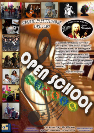 Visto il successo degli anni precedenti, anche quest’anno la Scuola di Musica “A. Vivaldi”, da 20 anni principale punto di riferimento per l’apprendimento della musica in città con un offerta formativa che si presenta particolarmente ricca e variegata, aprirà le porte a tutti coloro che vogliono intraprendere un cammino nel mondo della musica in modo amatoriale e professionale. Il 29 settembre 2018 dalle ore 16.00 ci sarà l’accoglienza da parte di maestri e allievi, durante la quale verranno presentati gli strumenti e per chi vuole potrà gratuitamente dilettarsi nel suonare gli stessi. L’associazione si avvale della collaborazione di persone altamente qualificate nel campo della musica, della cultura e dell’adesione di un gruppo di soci che quali amatori, sono desiderosi di diffondere questo tipo di discorso culturale. L’Associazione promuove tutte quelle manifestazioni come: concerti, conferenze, concorsi, convegni, corsi di perfezionamento e di aggiornamento, studi e approfondimenti e di tante altre attività che servono a far crescere gli aderenti all’insegna della musica come arte da apprendere, entusiasmo da condividere. Inoltre l’Associazione si vanta di avere una convenzione con il Conservatorio di Musica “Fausto Torrefranca” di Vibo Valentia che garantisce il riconoscimento ufficiale dei percorsi formativi con certificazioni di Competenza, previste nei livelli pre-accademici.