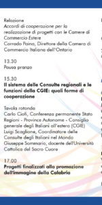 Dopo la pausa pranzo, i lavori riprenderanno nel pomeriggio, alle ore 15.30, con una tavola rotonda sul tema: “Il sistema delle Consulte regionali e le funzioni della CGIE: quali forme di comunicazione” a cui prenderanno parte Carlo Ciofi, della Conferenza Permanente Stato-Regioni-Province Autonome-Consiglio Generale degli Italiani all’Estero (CGIE), Luigi Scaglione, Coordinatore delle Consulte degli Italiani nel mondo e Giuseppe Sommario, docente dell’Università Cattolica del Sacro Cuore.