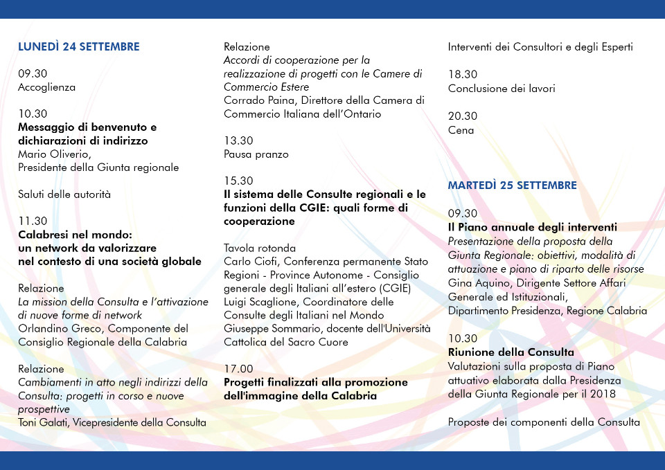 La chiusura dei lavori della Consulta è prevista per le ore 18.30 con l’intervento conclusivo del Presidente della Giunta regionale Mario Oliverio, a cui seguirà la cena di commiato.