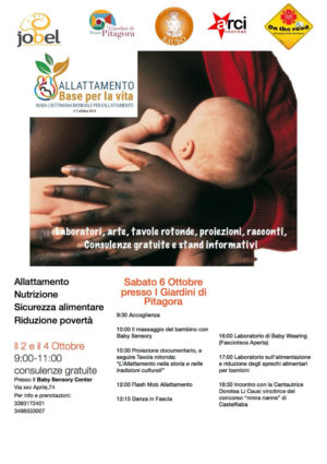Le iniziative, nate in collaborazione con il Consorzio Jobel, l’Arci di Crotone e l’Associazione Volontari di Strada prevederanno consulenze gratuite per Allattamento il 2 e il 4 Ottobre dalle 9 alle 11 presso il Baby Sensory Center in via xxv aprile 74, chi lo desidera potrà prenotare un incontro con un’ostetrica specializzata chiamando al 3393172401 o 3496533007. Il 6 Ottobre, presso i Giardini di Pitagora, si svolgerà un’ intera giornata, una vera festa, dedicata ad adulti e bambini ricca di laboratori, arte, musica, documentari e una tavola rotonda in cui si discuterà di allattamento come strumento per la sicurezza alimentare, riduzione della povertà, lotta all’inquinamento in contrapposizione con gli stereotipi sociali e il potere delle case farmaceutiche. La particolarità di quest’anno è che si svolgerà Un progetto nel progetto che vedrà protagoniste attive nella realizzazione della Danza in Fascia e del Laboratorio di Baby Wearing le donne e mamme ospiti del centro Sprar di Roccabernarda.
