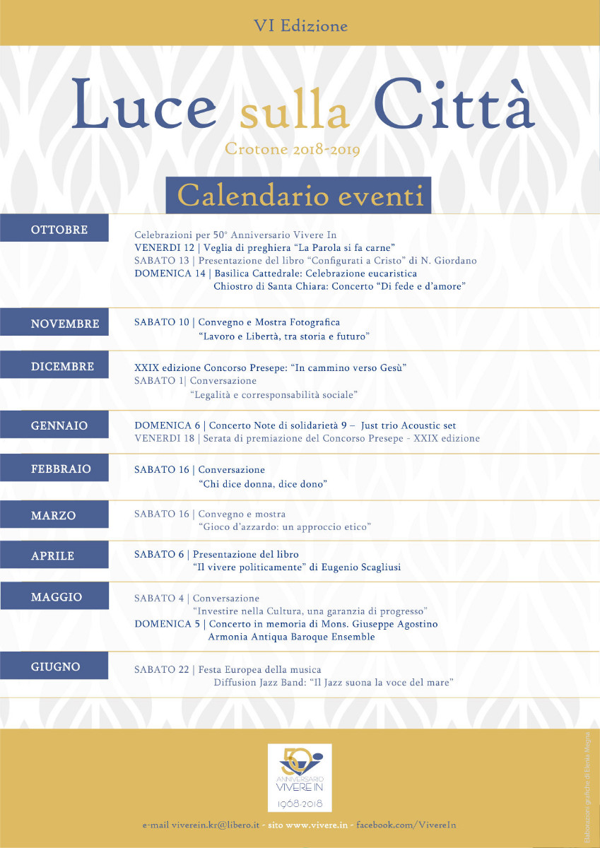 Il Movimento Vivere In offre alla città anche per il 2018-2019 il cartellone di iniziative culturali “Luce sulla città”, giunto alla sesta edizione.