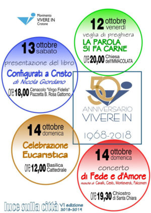 Sabato 13 ottobre alle ore 18.00 verrà presentato il libro “Configurati a Cristo”, il primo testo in cui il fondatore di Vivere In, don Nicola Giordano, ha per la prima volta parlato della dignità dell’uomo divinizzato. Ristampato di recente, il testo verrà presentato dal teologo don Fortunato Morrone e dalla vicepresidente del Movimento, Marisa Parato, con la sapiente moderazione del critico letterario Tommaso Cozzitorto.