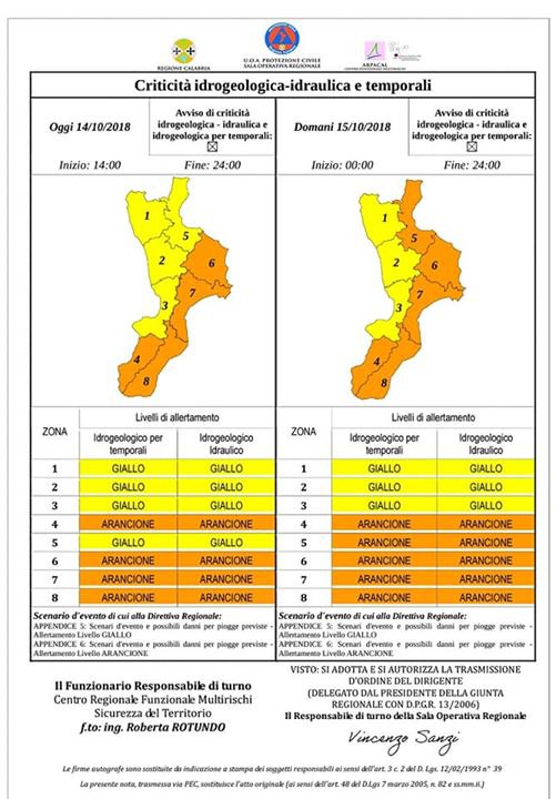 Messaggio di allertamento Arancione per previsioni meteorologiche avverse per Lunedi 15 ottobre 2018 pervenuto dalla Regione Calabria U.O.A. Protezione Civile Sala Operativa Regionale, interessante il territorio comunale, valido dalle ore 00,00 alle ore 24,00 di oggi Lunedi 15 ottobre 2018.