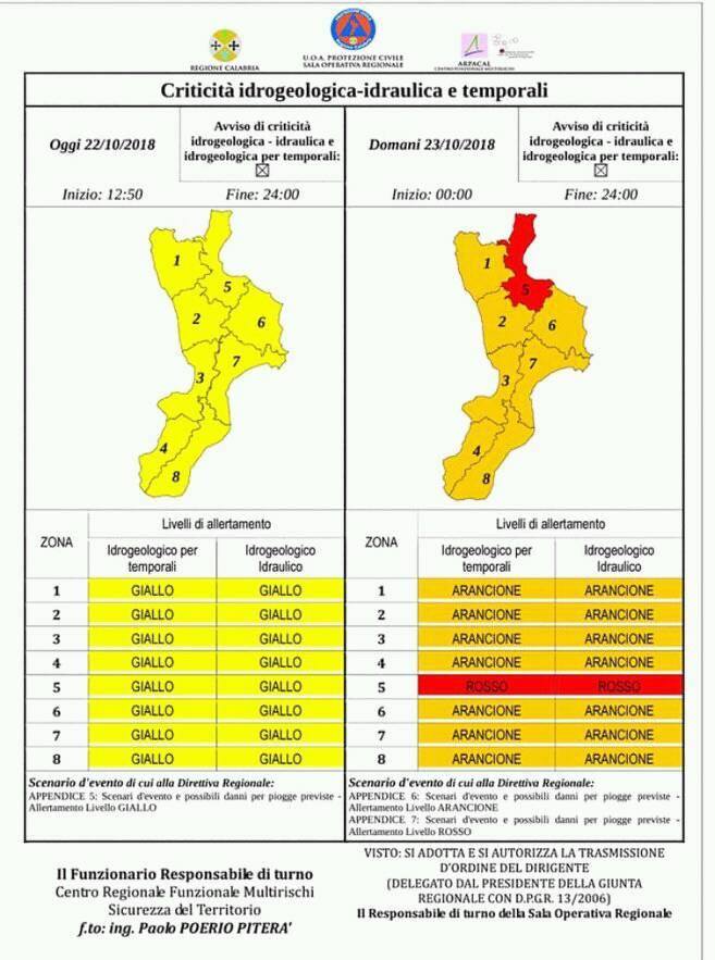 Messaggio di allertamento Arancione per previsioni meteorologiche avverse per martedi 23 ottobre 2018 pervenuto dalla Regione Calabria U.O.A. Protezione Civile Sala Operativa Regionale, interessante il territorio comunale, valido dalle ore 00,00 alle ore 24,00 di domani 23 ottobre 2018.