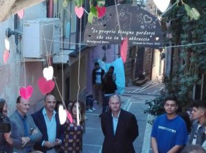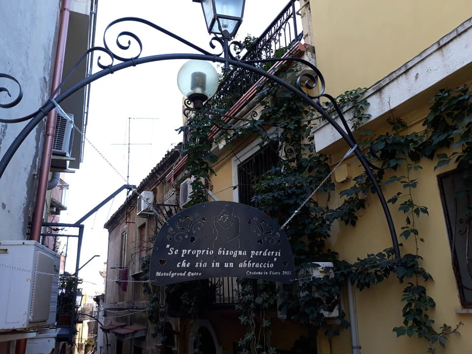 Una targa, realizzata in collaborazione con Metalgrond di Cutro, sistemata in un arco fiorito all’inizio del vicolo recita: “se proprio bisogna perdersi che sia in un abbraccio”.