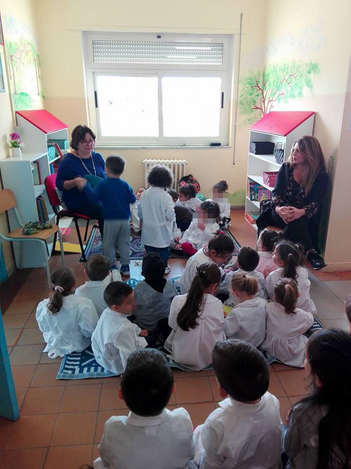 Maestra Teresa , angolo lettura , costituito presso la Scuola dell’infanzia di ViaXXV Aprile di
