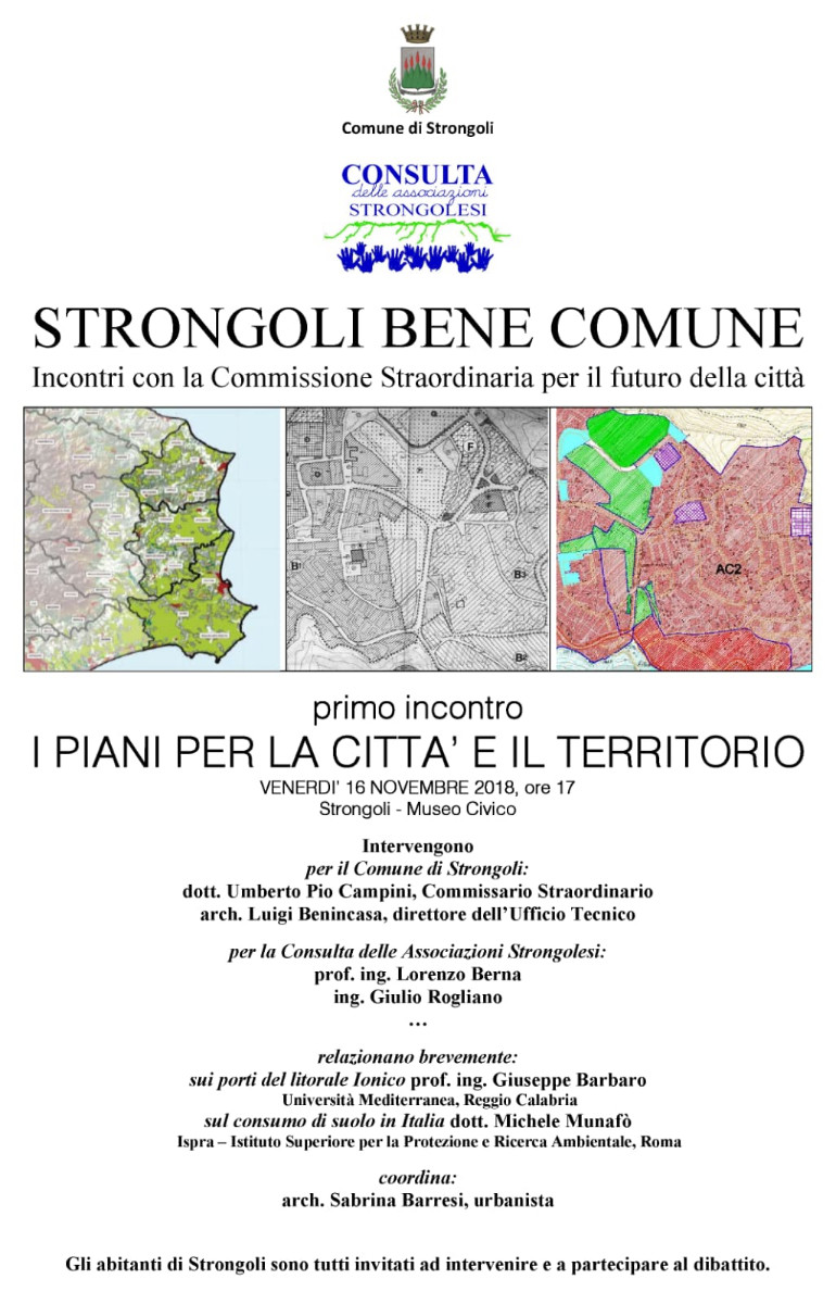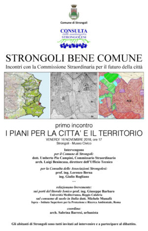 Si tratta del primo appuntamento che si terrà nel Museo Civico, in Corso Biagio Miraglia, venerdì 16 novembre p.v. alle ore 17. La Consulta delle associazioni di Strongoli, ha pianificato una serie di altri incontri, sia attinenti alle vicende tecniche che culturali e sociali, al fine di informare la popolazione ed i soggetti interessati. Nel corso del convegno interverranno per il Comune di Strongoli: il Commissario Straordinario, dr. Umberto Pio Campini ed il dirigente dell’ufficio tencico l’arc. Luigi Benincasa; per la Consulta delle Associazioni il prof. Ing. Lorenzo Berna, e l’ing. Giulio Rogliano. All’evento contribuiranno con collegamento Skype il prof. Ing. Giuseppe Barbaro dell’Università Mediterranea di Reggio Calabria che relazionerà sui porti del litorale; ed il dr. Michele Munafò dell’Ispra – Istituto Superiore per la protezione e ricerca ambientale di Roma che interverrà sul consumo di suolo in Italia. Il dibattito sarà coordinato dall’arch. Sabrina Barresi, urbanista. Ricordiamo che la Consulta delle Associazioni Strongolesi è stata costituita il 17 maggio scorso nell’Oratorio San Giuseppe della Parrocchia dei SS.Pietro e Paolo; rappresenta 26 associazioni di volontariato e diverse realtà del territorio impegnati in attività di solidarietà sociale, culturali, ambientali e ricreative. E’ uno strumento di promozione e di coordinamento delle varie realtà associative operanti sul territorio comunale, luogo di raccordo con la Commissione Straordinaria di Strongoli nella definizione e realizzazione di iniziative ed attività volte allo sviluppo della sussidiarietà locale, senza finalità di lucro, negli ambiti individuati. La Consulta delle associazioni è operativa a Strongoli anche grazie allo scambio reciproco di informazioni ed esperienze con il solo fine di attivare programmi di collaborazione fra le Associazioni verso obiettivi generali comuni, nel rispetto delle specifiche esigenze e sensibilità culturali e dell’autonomia delle singole associazioni. Gianni LeRose