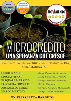 Il Meetup 5 stelle di Cirò Marina in collaborazione con il gruppo Meetup Crotone in Movimento ha organizzato per giorno 2 Dicembre alle ore 18.00 a Palazzo Porti (P.zza Diaz) un convegno sul Microcredito. Interverranno: l’Onorevole Barbuto, Guido Bianco, Simona Pisani e Pasquale Marasco del Meetup Crotone in Movimento, Eleonora Primocerio della BCC del Crotonese, Arcangelo Pierri come Tutor Ente Nazionale Microcredito e Marco Martino del Meetup 5 stelle Cirò Marina. Il microcredito è un fondo di garanzia gestito dal Ministero dello Sviluppo Economico in favore della promozione e dello sviluppo delle PMI. Il microcredito è uno strumento importante per la crescita del sistema imprenditoriale italiano, soprattutto alla luce delle attuali difficoltà del sistema. Negli ultimi due anni il fondo microcredito è stato finanziato, oltre che dallo Stato, dalle donazioni volontarie dei parlamentari del M5S. Con la locuzione, molto diffusa sui media negli ultimi mesi, di microcredito M5S si fa riferimento all’attività di concessione di micro finanziamento dedicata ad imprese e professionisti, che non hanno sufficienti garanzie da presentare, generalmente in fase di start-up dell’attività. Perché si parla di microcredito M5S? Il motivo è semplice. I parlamentari del MoVimento 5 Stelle (M5S) hanno finanziato il fondo attraverso la rinuncia mensile a parte dell’emolumento loro erogato. Tali soldi sono finiti direttamente al fondo tramite dei bonifici eseguiti sul conto del MISE. Nel 2015 tale fondo ha raggiunto i 40 milioni di euro (30 stanziati dallo Stato più i 10 versati dai parlamentari M5S). Si tratta in ogni caso di un’erogazione a titolo oneroso e non di un finanziamento a fondo perduto. La garanzia del microcredito M5S, ha come soggetti destinatari: Professionisti (iscritti agli ordini professionali o aderenti alle associazioni iscritte nell’apposito elenco tenuto dal MiSE) e imprese individuali titolari di partita IVA da non più di cinque anni e con massimo 5 dipendenti; Società di persone, società a responsabilità limitata semplificata o società cooperative titolari di partita IVA da meno di cinque anni e con massimo 10 dipendenti. I finanziamenti massimi che possono essere concessi con la garanzia del microcredito sono pari ad euro 25.000 per ciascun beneficiario. Il limite può essere aumentato di euro 10.000, qualora il contratto di finanziamento preveda l’erogazione frazionata subordinando il surplus finanziato al verificarsi di due condizioni: Il pagamento puntuale di almeno le ultime sei rate pregresse; Lo sviluppo del progetto finanziato, attestato dal raggiungimento di risultati intermedi stabiliti dal contratto e verificati dalla banca.