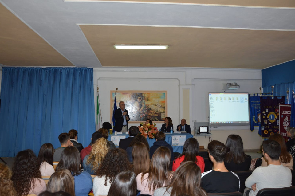 La Presidente del club, Lucia Scilanga, ha rimarcando il ruolo dei Lions nel FARE e l’importanza di operare nelle scuole per adempiere al dovere di promuovere la cultura come servizio, sia per elargire un diritto fondamentale ai giovani e sia per invitarli ad utilizzare la sapienza acquisita, con la mente e il cuore per renderla al mondo con il saper fare. Per questa opportunità ha ringraziato calorosamente la Dirigente Anania che ha ospitato, in maniera egregia, l’iniziativa. Legata alla cultura arbëreshe, al tavolo era presente anche uno dei docenti dell’Istituto, lo scrittore Carlo Rizzo, nativo di san Nicola dell’Alto, e convinta che la scuola, debba essere aperta al territorio ed alle associazioni perché possa continuare ad essere veicolo di cultura e baluardo di legalità, la dirigente ha ribadito la necessità di investire sui giovani per costruire un futuro migliore per tutti.