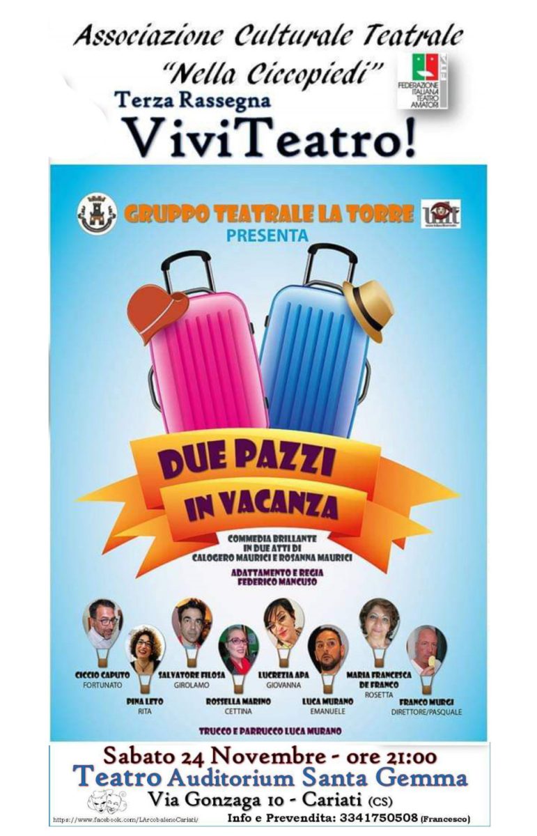 Dal Teatro Auditorium Santa Gemma, l’Associazione Culturale Teatrale “Nella Ciccopiedi” dopo il successo del 10 Novembre scorso con l’opera Filumena Marturano di Ed. De Filippo per la regia Di Miriam Crivaro, riaprirà, Sabato 24 Novembre alle ore 21:00 , il sipario, al secondo appuntamento della terza Rassegna ViviTeatro. Ospiti la Compagnia La Torre di Torre Melissa che porterà in scena lo spettacolo teatrale “Due Pazzi in Vacanza” di Calogero e Rosanna Mauricio per la regia di Federico Mancuso. Evento in concorso per il Premio ViviTeatro 2018/2019.