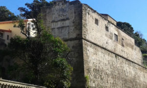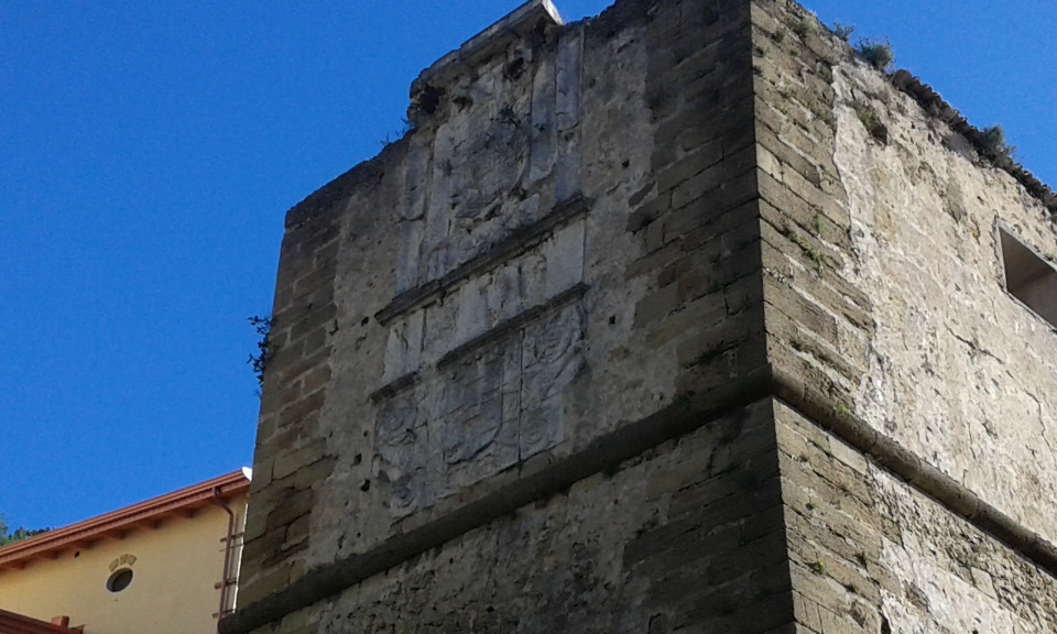 Passeggiando tra i portici e il mercato ortofrutticolo ed inoltrandosi fino ai piedi dell’antico castello di Carlo V in via Generale Tellini di Crotone, ti para davanti agli occhi, su in alto sulle mura, il grande stemma calcareo apposto su un bastione dove sono riprodotte le insegne imperiali e del viceré don Pedro de Toledo. Si tratta di un’opera scultorea cinquecentesca posta sul terzo superiore del musone del bastione Don Pedro che, ovviamente necessita di urgenti interventi di restauro. Ugualmente altre diverse aree delle mura del castello presentano delle grandi lesioni che reichiedono interventi di restauro e recupero sulla Discesa San Leonardo ed in altri punti a salire fino al bastione della Mirandola. Eseguita nel 1546, l’arma imperiale fu collocata l’anno successivo nell’attuale sede, il bastione che guardava la Porta grande da sud come il bastione Marchese guardava a nord. Su questo bastione, invece, fu edificata la grande epigrafe calcarea, celebrativa dei committenti e del progettista, il barone Gian Giacomo d’Acaya, andata distrutta nel XIX secolo.