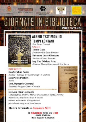 In occasione delle “Giornate in Biblioteca”, nel Museo Diocesano di Santa Severina, sarà presentato il libro “Alberi testimoni di tempi lontani” di Don Pietro Pontieri. Nella stessa occasione verranno presentati gli ultimi lavori di restauro dei beni archivistici e bibliografici del Polo Culturale Integrato di Santa Severina e sarà allestita una Mostra Personale di Pino Perri.