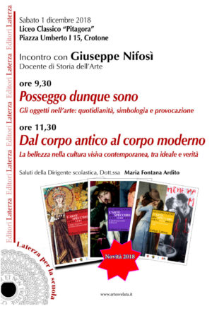 I temi che il docente di Storia dell’Arte tratterà saranno: “Posseggo dunque sono. Gli oggetti nell’arte: quotidianità, simbologia e provocazione” e “Dal corpo antico al corpo moderno. La bellezza nella cultura visiva contemporanea, tra ideale e verità”. L’incontro, che si terrà presso l’Aula Magna, organizzato in collaborazione con Fiorenzo Giuseppe Agenzia di Cosenza e con la casa editrice Laterza, prevede i saluti della prof.ssa Maria Fontana Ardito, dirigente del Liceo. L’iniziativa rientra nelle attività didattiche dell’indirizzo AUREUS di cui è referente la prof.ssa Maria Francesca Greco che è giunto al secondo anno.