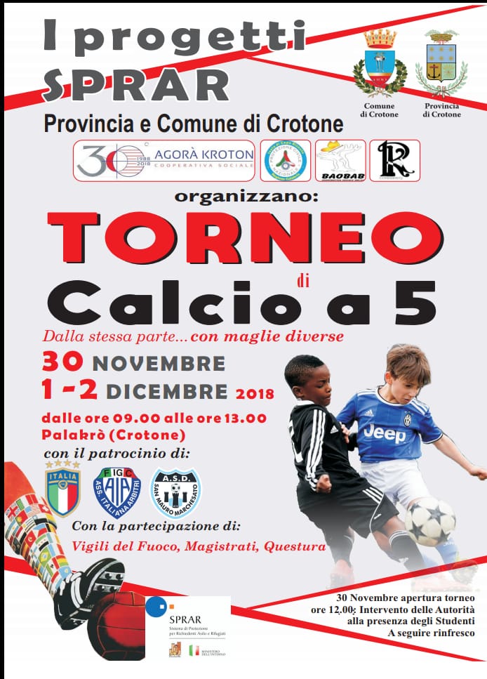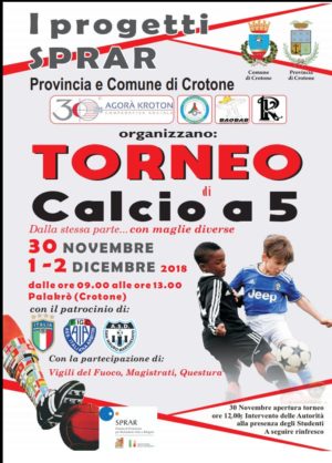 Parliamo del Torneo di Calcio a 5, “Dalla stessa parte…con maglie diverse”, organizzato dalle cooperative Agorà Kroton, Baobab, Kroton Comunity, e Prociv Arci Isola Capo Rizzuto, nell’ambito dei progetti Sprar di Comune e Provincia di Crotone, che si svolgerà al Palakro da venerdì 30 novembre a domenica 2 dicembre, e al quale parteciperanno le squadre dei beneficiari Sprar, dei Vigili del Fuoco, Questura e Magistrati. Lo stesso organizzato grazie al protocollo con l’Asd S.Mauro e la collaborazione del mister Domenico Rocca.