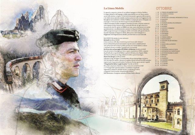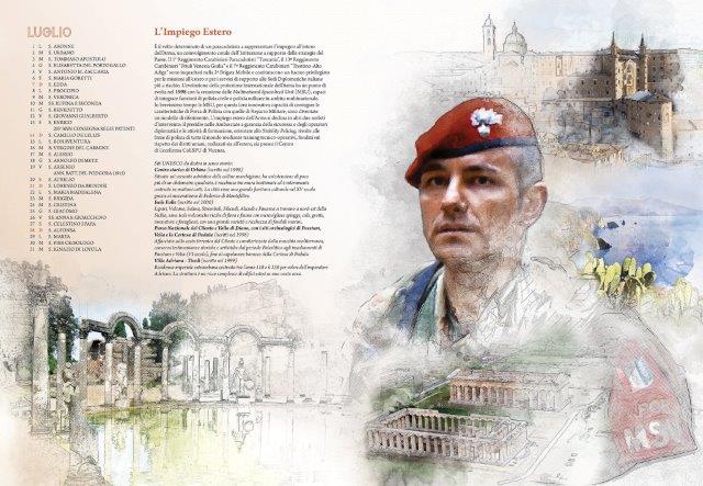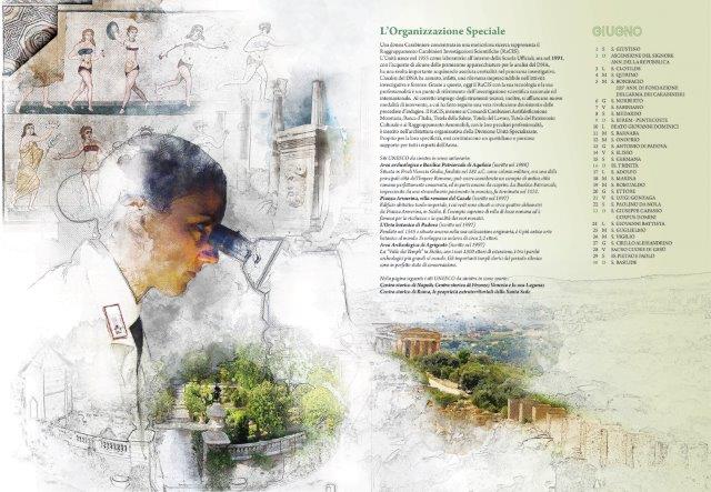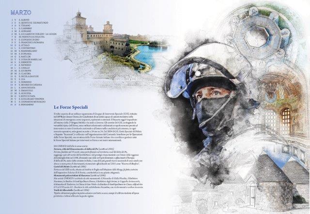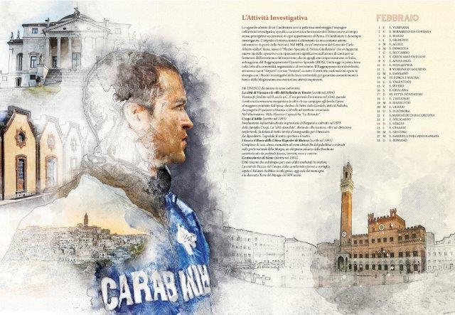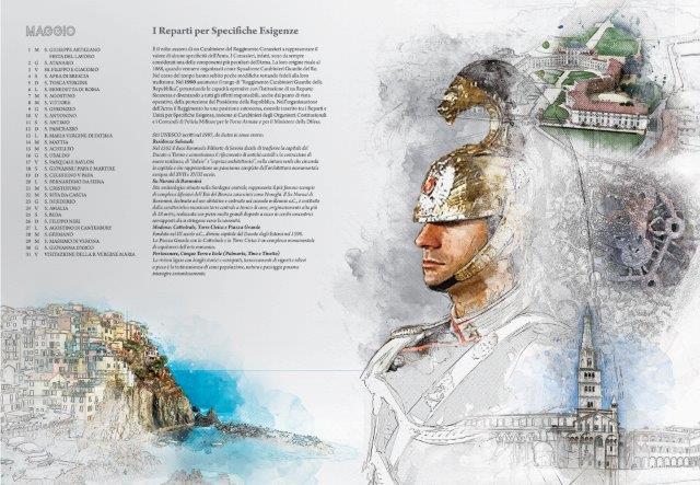 Le tavole del Calendario, ideate e realizzate sotto la direzione artistica di Silvia di Paolo, presentano una carrellata di tutti i siti italiani tutelati dall’Unesco. Sono stati “inseriti con immagini o menzioni tali da fornire una visione complessiva della varietà di scenari della nostra penisola” – ha dichiarato nel suo intervento il Comandante Provinciale, Ten. Col. Sutera. “L’Italia è la Prima nazione al mondo per il numero di beni inseriti nella lista del Patrimonio dell’Unesco: sono complessivamente 54 i siti culturali e naturali che hanno ottenuto il prestigioso riconoscimento. Meravigliose risorse distribuite su tutto il territorio proprio come i Carabinieri, che ormai da oltre due secoli sono tutt’uno con le comunità, costituendo elemento essenziale di ogni comune, borgo, frazione o quartiere di una grande città. L’Arma dei Carabinieri è, infatti, costante punto di riferimento per i cittadini con le sue capillari articolazioni territoriali – 5.100 tra Stazioni, Tenenze e Compagnie – e le sue componenti specialistiche, unanimemente riconosciute strutture di eccellenza. Questo sistema molecolare di sicurezza costituisce un insostituibile presidio a protezione delle bellezze italiane. In sintesi, si potrebbe dire che cultura e legalità sono due facce della stessa medaglia e rappresentano il filo conduttore del Calendario 2019”. Ecco perché, in parallelo al riconoscimento di tali bellezze, nel Calendario Storico 2019 è stato tracciato un breve racconto sul percorso evolutivo dei Carabinieri negli ultimi decenni, a partire dal Comando Tutela Patrimonio Culturale avviato nel 1969, che di recente ha fornito i primi “caschi blu della cultura” all’Unesco. Le altre articolazioni dell’Arma accompagnano le immagini dei luoghi simbolo della Nazione, attraverso la rappresentazione di uniformi e principalmente di volti. “Il volto” – come sottolineato dal Comandante Generale dell’Arma, Gen. C.A. Giovanni Nistri, durante la presentazione alla Scuola Ufficiali Carabinieri – “è lo specchio dell’anima, come i luoghi sono lo specchio di un Paese. E quelli presenti nelle tavole… stanno ben attenti a non invaderle. Si fondono nell’insieme…perché noi siamo e ci sentiamo parte integrante del paesaggio italiano, inteso come identità nazionale”.