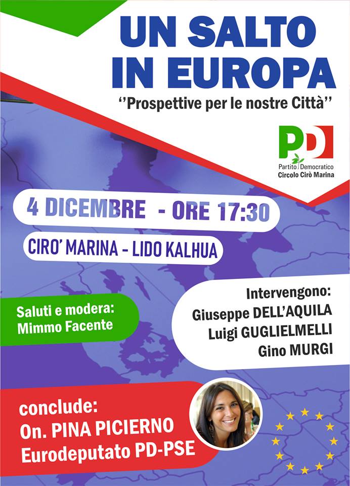 Domani 4 dicembre alle ore 17:30 a Cirò Marina, presso il Lido Kalhua sul lungomare sud, il Partito Democratico organizza un momento di incontro dal titolo “Un Salto in Europa – Prospettive per le nostre Città” al quale parteciperà l’Europarlamentare On. Pina Picierno.