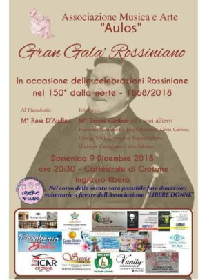 Domenica 9 dicembre 2018 alle ore 20,30 presso la Cattedrale di Crotone, il soprano Teresa Cardace, cantante lirica e accreditata docente di canto presso i conservatori di musica, in collaborazione con l’associazione Arte e Musica “Aulos” di Lamezia Terme diretta dal M°Rosa D’Audino, presenterà il “GRAN GALA’ ROSSINIANO” in occasione delle celebrazioni nel 150° della morte di Gioacchino Rossini.