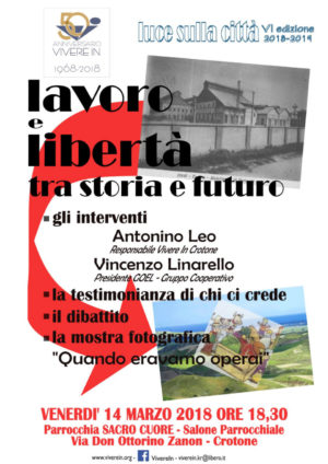 Interverranno portando la loro esperienza Vincenzo Linarello, presidente di GOEL – gruppo cooperativo, una iniziativa che si propone di affrontare la piaga della disoccupazione con proposte concrete di lavoro, e Antonino Leo, responsabile del Movimento Vivere In di Crotone che in questa occasione presenterà il progetto “Costruire Futuro”, una esperienza che si propone di affrontare in modo propositivo il tema del lavoro nel nostro territorio.