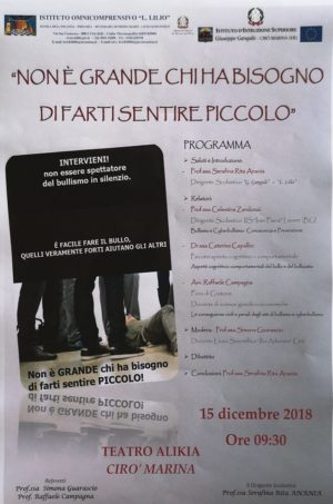 Il convegno, dal titolo “Non è grande chi ha bisogno di farti sentire piccolo”, che si terrà presso il Teatro Alikia di Cirò Marina, in data 15 dicembre 2018, alle ore 10:00, vuole essere, pertanto, un’occasione di discussione e di approfondimento dei fenomeni relativi al disagio ed alla devianza minorile, rappresentando un’opportunità di arricchimento, non solo per la scuola, luogo di crescita civile e sviluppo culturale della persona, ma per l’intero territorio, in un contesto sociale, fatto di diritti e doveri.