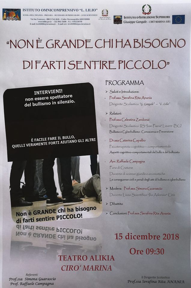 Alla luce delle nuove emergenze in tema di bullismo in ambito scolastico ed in ossequio alle Linee di orientamento per la prevenzione e il contrasto del cyberbullismo, previste dal Dipartimento per il sistema educativo di istruzione e di formazione presso il Ministero dell’Istruzione, dell’Università e della Ricerca, l’Istituto di Istruzione Superiore “G. Gangale” di Cirò Marina (KR) e il Liceo Scientifico “Ilio Adorisio di Cirò (KR), hanno ritenuto opportuno organizzare un convegno su un tema di così stretta attualità, finalizzato alla conoscenza ed alla prevenzione dei fenomeni criminali legati all’età giovanile, emergenti nelle istituzioni scolastiche.