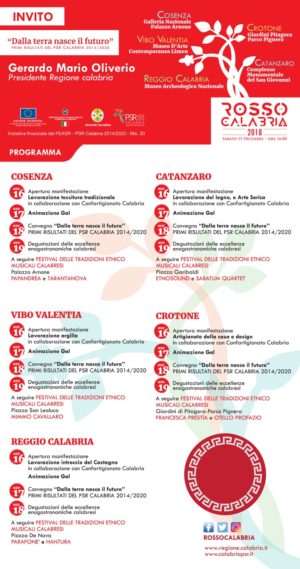 Un appuntamento tanto atteso dai calabresi, Rosso Calabria, che per la prima volta, dalla Cittadella Regionale, si sposterà nei cinque capoluoghi di provincia. Le location saranno i musei e i luoghi deputati alla cultura: Palazzo Arnone a Cosenza, il Complesso Monumentale S.Giovanni a Catanzaro, i Giardini di Pitagora a Crotone, il Museo D’Arte Limen a Vibo Valentia ed il Museo Archeologico Nazionale di Reggio Calabria. Dunque, la Calabria positiva, l’eccellenza e l’unicità dei prodotti dell’agroalimentare regionale, le tradizioni e il folklore saranno protagonisti dell’evento. Musica etnico-popolare, tavole rotonde, laboratori artistici, enogastronomia, questi gli ingredienti dell’edizione 2018, il tutto annaffiato dal buon vino rigorosamente made in Calabria.