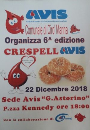 Anche quest’anno l’evento si terrà in piazza Kennedy, presso i locali della sede Avis dalle ore 18.00. Verranno preparate dalle sapienti mani delle nostre collaboratricie distribuite gratuitamente gustosissime crespelle a tutti i partecipanti.
