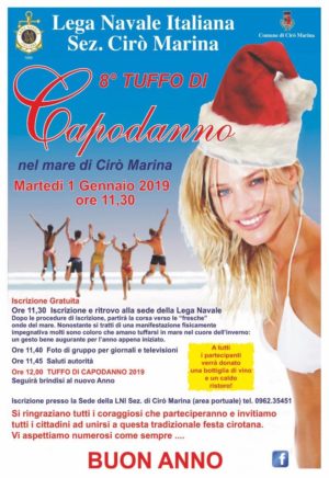 Il primo gennaio 2019 a Cirò Marina si svolgerà l’8° Tuffo di Capodanno, durante il quale diverse persone sfideranno il freddo tuffandosi in mare. L’evento è organizzato dalla Lega navale italiana sezione di Cirò Marina con il patrocinio del Comune di Cirò Marina. Alle 11.30 è previsto il ritrovo per le iscrizioni in piazzale lega navale e alle 12.00 i partecipanti si tufferanno in mare. Alle 12.30 ci sarà la consegna di un attestato di partecipazione e un piccolo omaggio a tutti i partecipanti.