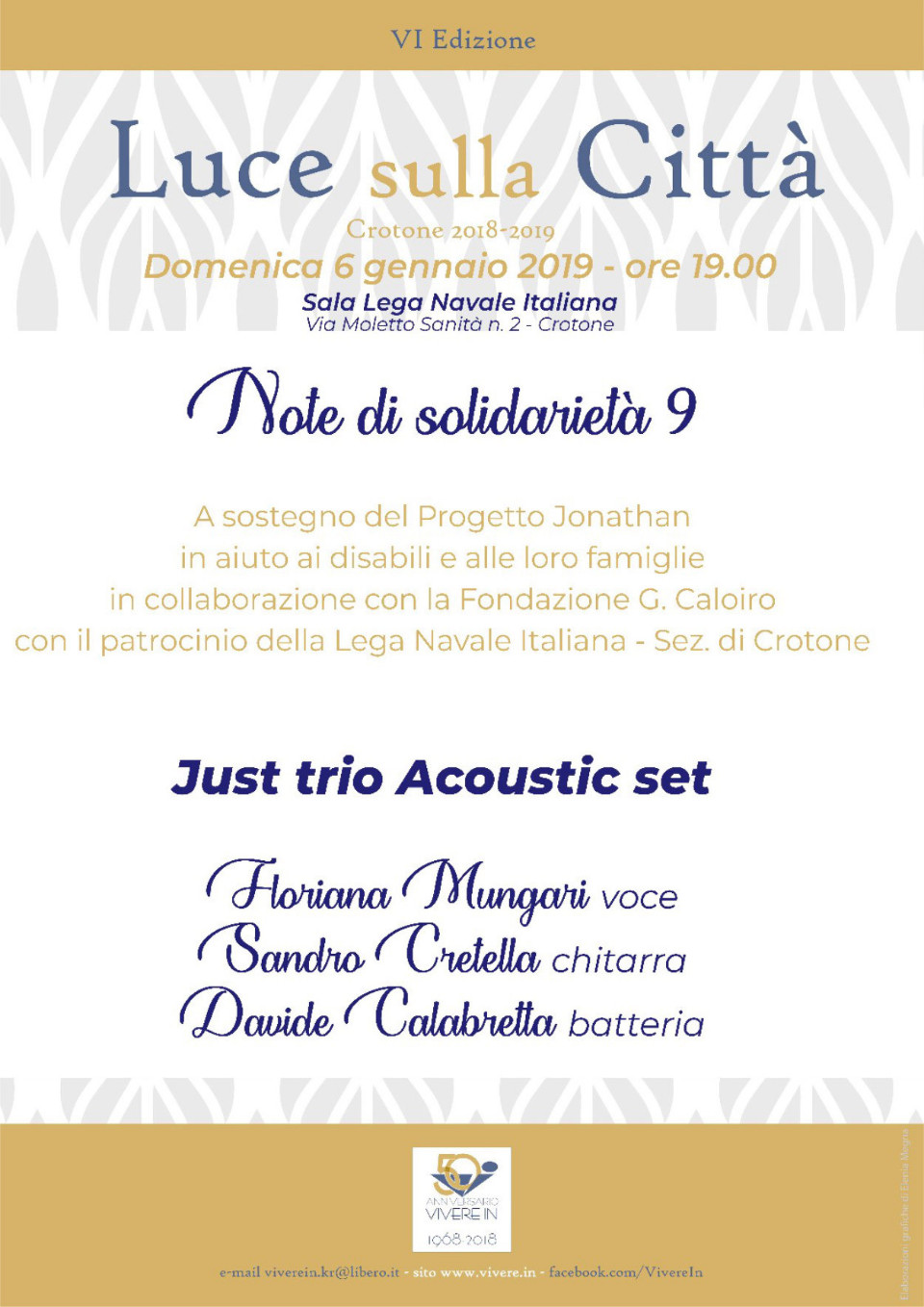 Come si evince dall’allegato invito, l’Associazione Vivere In organizza per il 6 gennaio, giorno dell’Epifania, il nono appuntamento del concerto “Note di solidarietà”, “Just trio Acoustic set”.