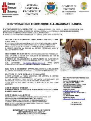 Per ulteriori informazioni ci si può rivolgere agli sportelli del Servizio Veterinario dell’Azienda Sanitaria a Crotone in via Botteghelle, a Cirò Marina, Roccabernarda e Castelsilano.
