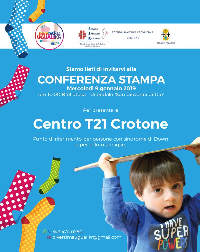 Il Centro T21 sarà punto di riferimento per persone con sindrome di Down e per le loro famiglie promosso dall’associazione “Diversi ma uguali KR” col contributo dell’Azienda Sanitaria Provinciale di Crotone. In particolare, i bambini con trisomia 21 o malattie rare più in generale, avranno una corsia preferenziale di rapido accesso per i controlli medici previsti dalle linee guida ministeriali e dell’Edsa (European down syndrome association).