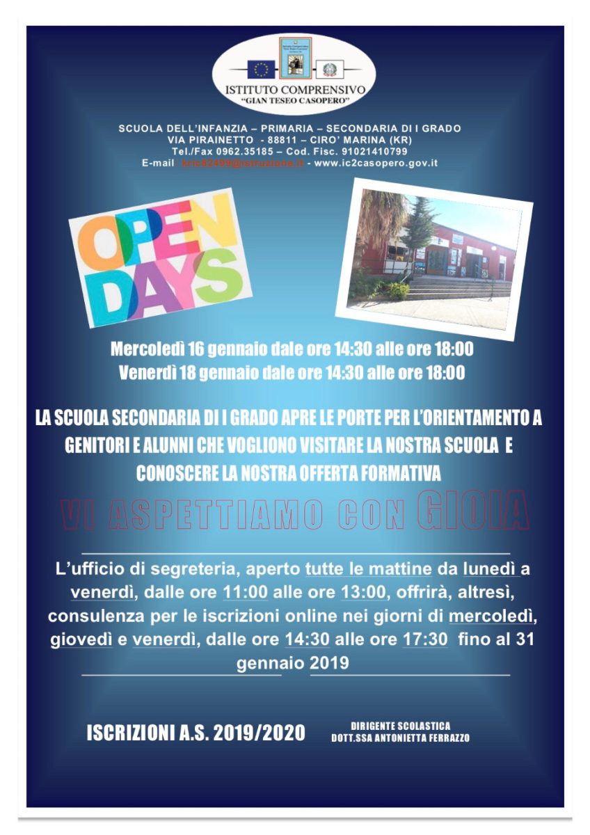 Open Day da lunedi 14 gennaio all’istituto Comprensivo Casopero di Cirò Marina