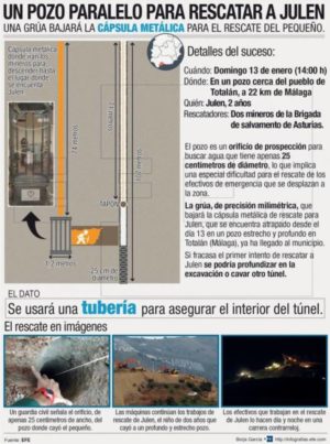 Ancora minuti di speranza e di angoscia per il piccolo Julien, il bimbo di due anni che lo scorso 13 gennaio è caduto in un pozzo nella cittadina di . Ora, evidenzia Giovanni D’Agata, presidente dello “Sportello dei Diritti”, otto minatori hanno iniziato il loro lavoro per entrare nel tunnel, la parte più pericolosa dell’operazione. Sono infatti iniziate le operazioni di questa nuova fase del salvataggio del bambino intrappolato sotto terra dal 13 gennaio. Sono scesi in una capsula metallica attraverso la perforazione e stanno scavando a mano circa quattro metri in orizzontale, dove si crede che sia il bimbo.