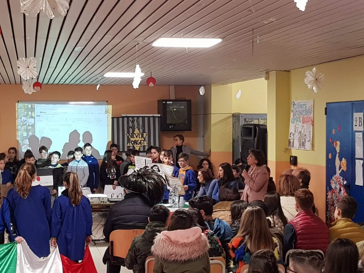 Dopo i saluti delle autorità e dopo la testimonianza del sig. Giuseppe CREA, si sono esibiti i ragazzi della Scuola Secondaria di primo grado e gli alunni delle classi quinte della scuola primaria in una drammatizzazione che ha commemorato le vittime dell’Olocausto, al fine di stimolare nelle giovani generazioni una riflessione sul tema e preservarne la memoria.