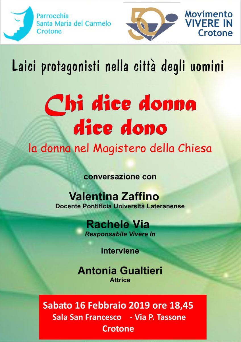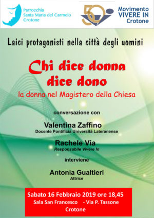 L’incontro è animato dal contributo di Valentina Zaffino, docente presso la Pontificia Università Lateranense, di Rachele Via, responsabile del Movimento Vivere In e dall’attrice Antonia Gualtieri.