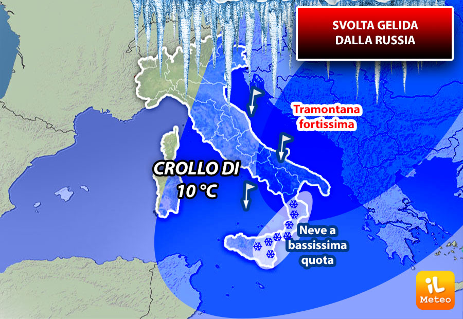 Anomalia per il mese di febbraio, a partire da venerdì 22 febbraio 2019, una perturbazione in arrivo dalla Russia porterà di nuovo neve e gelo. Cominceranno ad affluire fredde correnti dai quadranti settentrionali che faranno calare sensibilmente le temperature anche di 10°C in pochissime ore dapprima al Centro-Sud (versante Adriatico in primis) e poi anche al Nord.