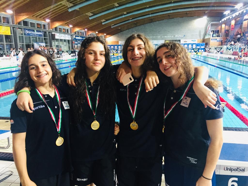 Ma l’impensabile è accaduto nella staffetta 4×50 nuoto ostacoli femminile (Filippelli – Iuticone – Ioppoli – D’Angerio ) dove le quattro terribili ragazze hanno centrato uno storico oro con una prestazione superlativa chiusa a soli 7 decimi dal Record Italiano. E’ la seconda prestazione di sempre mai nuotata in staffetta a livello nazionale. Quinto posto poi per la staffetta maschile (Arabia – Buzzurro – Masellis -Riillo) che si colloca tra le migliori a livello nazionale.
