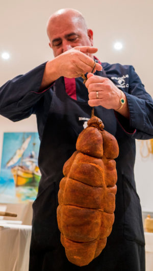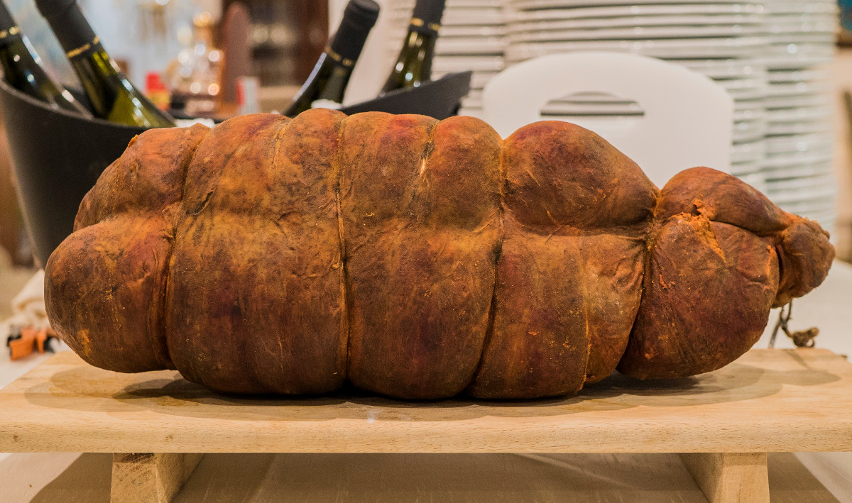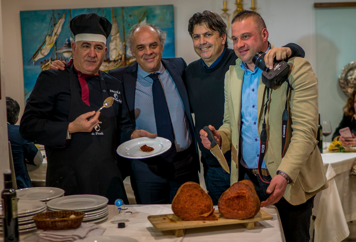 L’arte culinaria del grande cuoco mediterraneo Ercole Villirillo e la ’Nduja di Spilinga ispirata dall’autentica filosofia della filiera corta. A Crotone, giovedì 28 febbraio, si è vissuta una serata ricca di stimoli culturali, volta alla massima valorizzazione e promozione del vero Made in Calabria. Una ’Nduja record di circa 8 chili, ad orba unica e quindi non cucita, maturata per oltre 12 mesi, affumicata in modo naturale, è stata tagliata con una certa solennità e degustata dai vari ospiti presenti. Sapori e aromi unici, rari, preziosi, distintivi, identitari. Il giovane imprenditore agricolo Michele Dotro, che l’ha curata personalmente, ha realizzato questo “capolavoro” partendo dalle materie prime di straordinaria qualità prodotte tutte nel suo comprensorio di provenienza: le carni e il grasso di maiale, con le porzioni più pregiate della pappagorgia e della pancetta; il peperoncino autoctono piccante “Tri Pizzi”, selezionato, essiccato e macinato in proprio; la maturazione nel contesto collinare del Monte Poro che offre tutte le condizioni pedoclimatiche più congeniali.