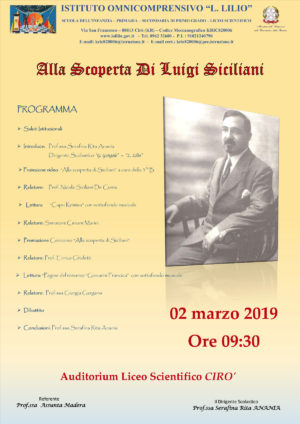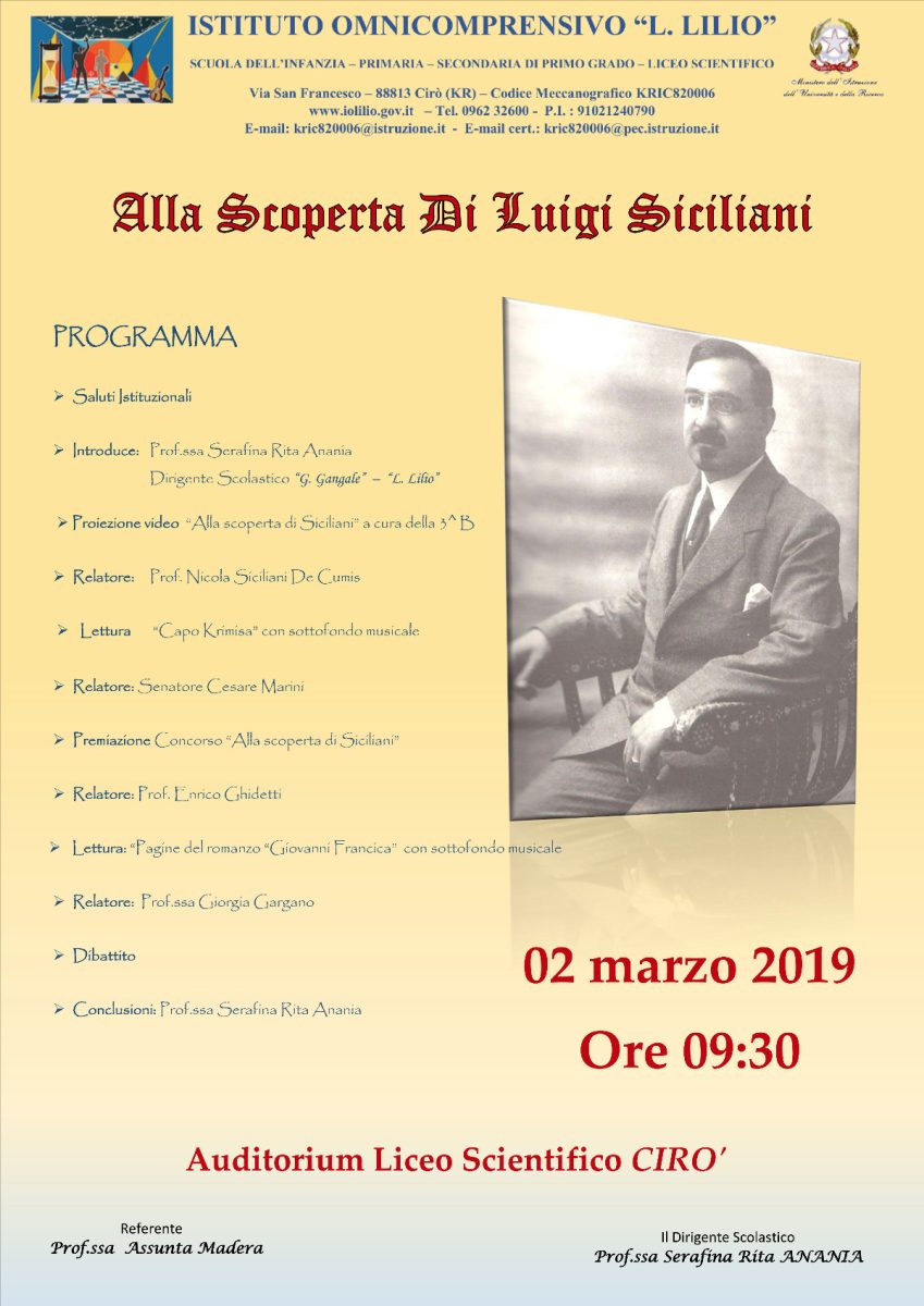 Un personaggio poliedrico, che ha lasciato una forte impronta di sé nella storia italiana del primo Novecento. Autore indefesso e prolifico, già da giovanissimo pubblicò il suo primo studio di argomento Pascoliano, dedicandosi in seguito ad una intensa attività letteraria. Erudito e coltissimo, conosceva perfettamente molte lingue antiche e moderne. Fu uomo politico impegnato e patriota convinto, autore pregevole e sopraffino,traduttore squisito e mirabile, legatissimo alla sua terra, della quale cantò i fasti del passato magno-greco, appassionato cultore della storia dell’arte, contribuì alla scoperta del tempio di Apollo Aleo a Cirò Marina. Stiamo parlando di Luigi Siciliani, nato a Cirò nel 1881. Un illustre cittadino cirotano, che va conosciuto, rivalutato e finalmente apprezzato come merita. Proprio con questo scopo, gli alunni del Liceo Scientifico “Lilio” si sono dedicati negli ultimi anni, sotto la guida attenta della professoressa Assunta Madera, allo studio e alla ricerca su Luigi Siciliani, e nella giornata di sabato 2 Marzo hanno organizzato un interessante convegno che hanno voluto intitolare “Alla scoperta di Luigi Siciliani”.