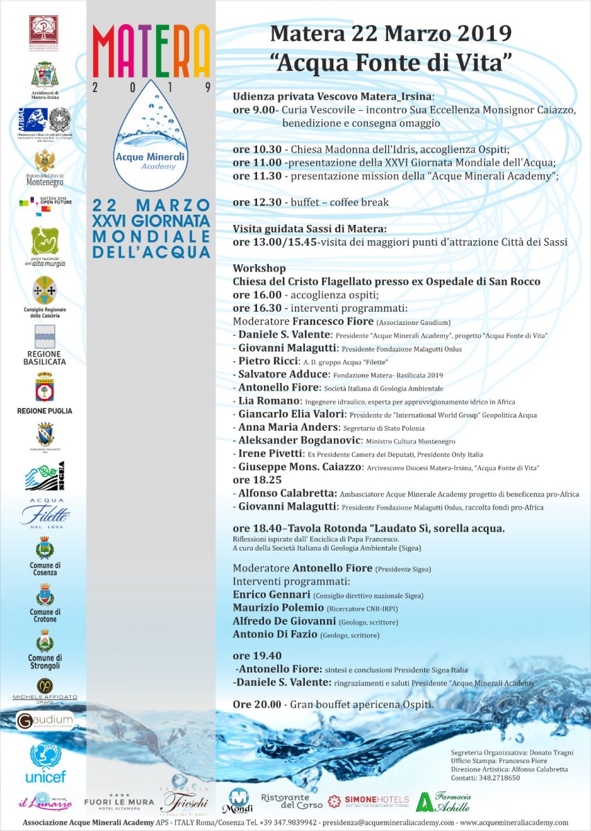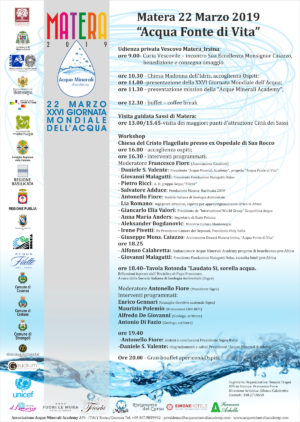 L’evento itinerante che parte dalla Calabria quest’anno si terrà a Matera il 22 marzo prossimo la XXVI Giornata Mondiale dell’Acqua. L’Associazione “Acque Minerali Academy”, presieduta da Daniele Salvatore Valente, dopo l’edizione 2018 tenutasi a Roma presso la Santa Sede in Vaticano omaggiando Papa Francesco l’acqua dell’antica fonte dei Vescovi di Umbriatico, quest’anno, ha scelto di omaggiare Matera quale Capitale Europea della Cultura ed emblema di Città dell’acqua, con l’acqua dell’antica fonte di Papa Antero di Petelia, XIX° della serie dei Pontefici, bottiglia artistica realizzata per l’occasione dal maestro orafo Michele Affidato.