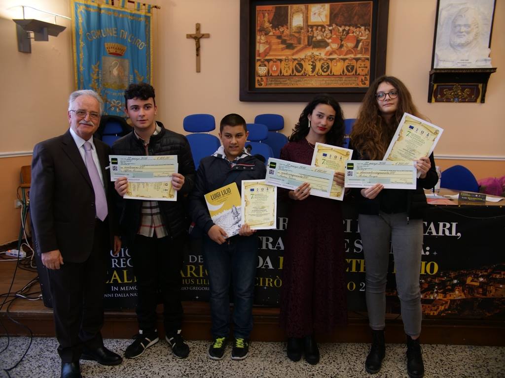 Anche il sindaco Francesco Paletta, ha ricordato l’importanza dell’approvazione da parte del Parlamento della legge sulla giornata nazionale del calendario, affinchè possa ottenere il riconoscimento di patrimonio dell’umanità. Novità su Lilio sono emerse dagli studi del prof. Giuseppe Renda direttore dell’archivio storico di Crotone, il quale riferiva:” che attraverso l’individuazione di documenti notarili scandagliati, è emerso l’esatta ubicazione della casa e i terreni della famiglia Giglio o Lilius, nel borgo medievale di Cirò, alla fine del 1500; inoltre prosegue- dagli atti redatti dal notaio Consolo e Abbozzino, nel 1573, 1576, – la casa era nel rione Falcone nell’incrocio tra i due burroni. Ad impreziosire il convegno la relazione del prof. Guglielmo Genovese dell’ Università dell’Aquila che è intervenuto su: Mito e identità su- “Filottete ed altri modelli precoloniali fra Crotone e Sibari” e della prof. Luciana De Rose, dell’Unical, che è intervenuta invece su-“ Astronomia e Scienza in Magna Grecia. La giornata è culminata con la proclamazione dei vincitori del concorso di poesia -“Il calendario perfetto” riservato alle scuole della provincia. Questi i vincitori del concorso: Primo posto per Giorgia Bolano 3^ A dell’Istituto Filottete di Cirò Marina; seconda: Valeria Santoro, 3^ B, I. C. M. G. Cutuli di Crotone; terzo, Giovanni Afflitto 3^ A I. c. di Torretta di Crucoli. Infine il premio della Critica è stato assegnato a Giuliano Le Quaglie, 2^ A. I. O. Lilio di Cirò. All’incontro era presente oltre al prefetto anche il capitano dei carabinieri di Cirò Marina Alessandro Epifanio, il comandante della stazione di Cirò Ivo Belculfinè , il comandante stazione carabinieri Forestale di Cirò Maresciallo ordinario Donato Mingrone.