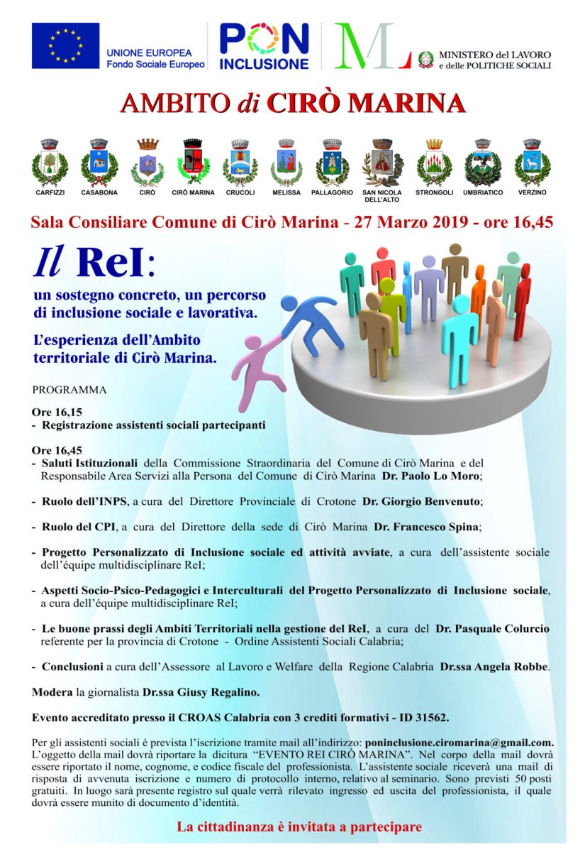 A tal fine, con la presente si invita la S.V. a partecipare all’evento Il ReI: un sostegno concreto, un percorso di inclusione sociale e lavorativa” che si svolgerà il 27 Marzo 2019 alle ore 16,45 presso la Sala Consiliare del Comune di Cirò Marina.