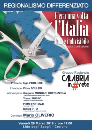 “C’era una volta l’Italia…Una e indivisibile”, questo il titolo del convegno sul regionalismo differenziato organizzato dal gruppo regionale di Calabria in Rete ed in programma venerdì 29 marzo 2019 alle ore 17 al Lido degli Scogli a Crotone. Un appuntamento importante per discutere di regionalismo differenziato da una visuale non solo dell’intero Paese, ma del Mezzogiorno ed in particolar modo della Calabria.