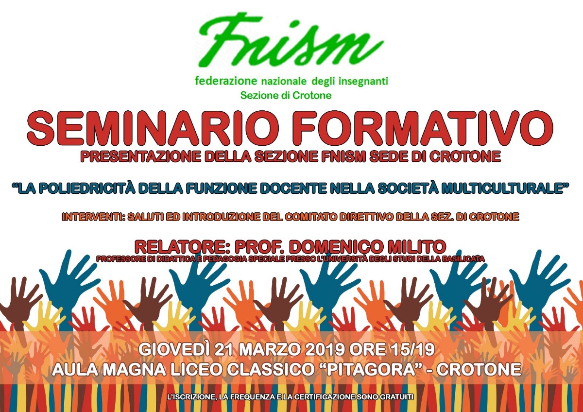 Una presenza numerosa di docenti ha preso parte al Seminario Formativo “La poliedricità della funzione docente nella società multiculturale” giovedi 21 Marzo presso l’Aula Magna del Liceo Classico Pitagora di Crotone, gentilmente concessa dal Dirigente Dott.ssa Maria Fontana Ardito.