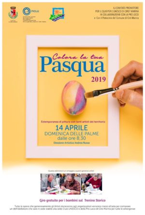 Il Comitato Promotore per il Club per l’UNESCO e La Pro Loco di Cirò Marina vi invitano a partecipare all’evento “COLORA LA TUA PASQUA 2019” che si terrà in piazza Diaz il 14 aprile domenica delle Palme. Questa quarta Edizione sarà dedicata agli Artisti Bongiorno – Colosimo – Grillo che con la loro espressione artistica hanno contribuito a colorare il mondo ed impreziosire la manifestazione.